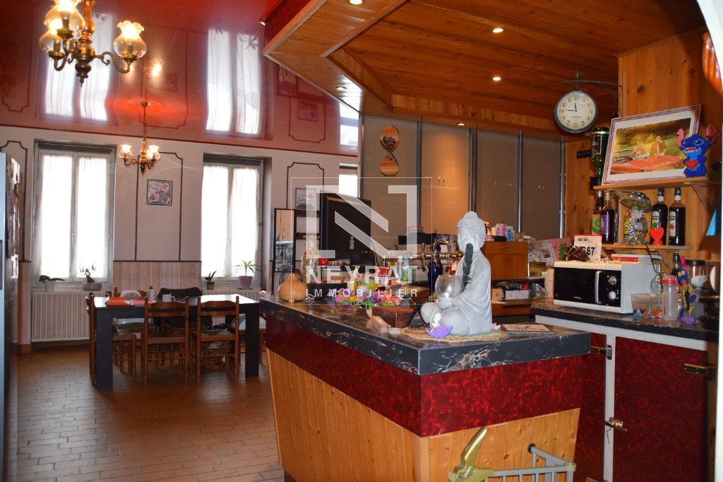 Le rez-de-chaussée propose un bel agencement issu de l'ancienne activité hôtelière : une entrée desservant une cuisine aménagée et équipée, un bar et un vaste séjour-salon (ancienne salle de restaurant), agrémenté d'un insert bois.