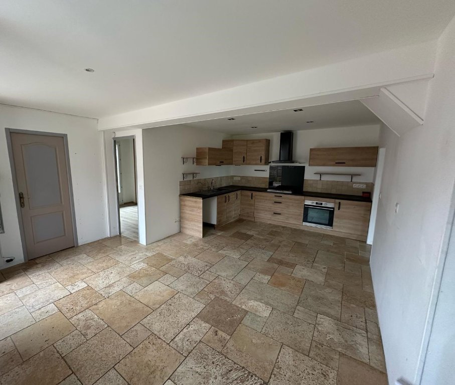 Cuisine aménagée ouverte sur une spacieuse pièce de vie lumineuse de 35 m²