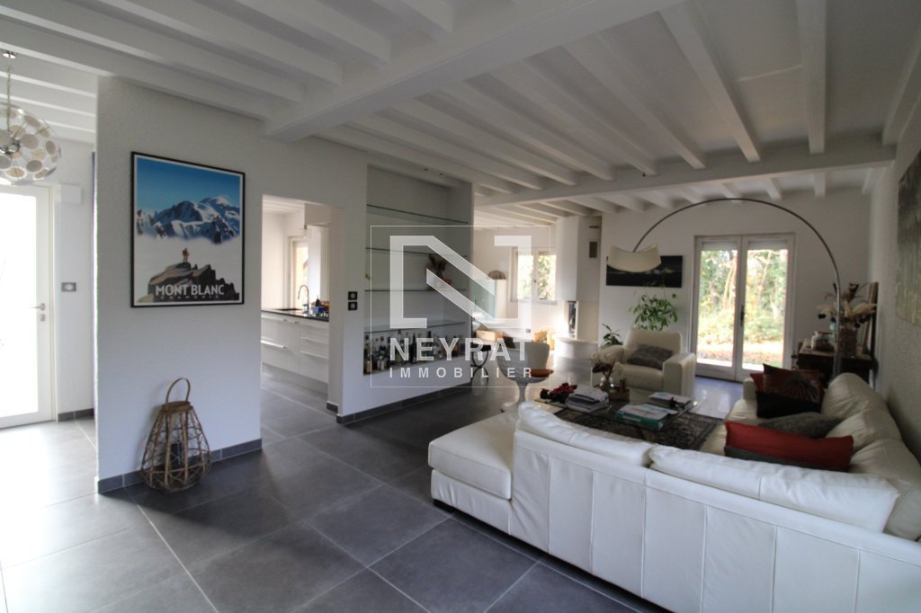 Au rez-de-chaussée, une entrée dotée d'un placard mural s'ouvre sur une pièce de vie de 60 m² : salon et séjour se prolongent naturellement vers une cuisine équipée de qualité. Les nombreuses fenêtres baignent l'espace de lumière et facilitent les circulations vers la terrasse, équipée de deux stores bannes électriques, idéale pour les repas en extérieur ou la détente au soleil.