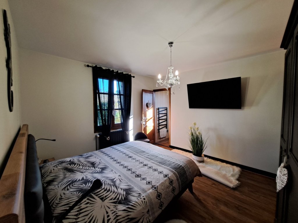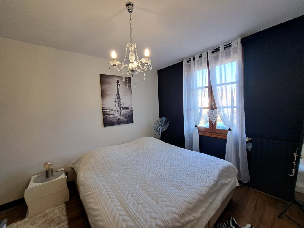 Au sous-sol, vous trouverez une chambre supplémentaire, une salle d'eau avec WC, une buanderie, ainsi qu'un double garage avec porte motorisée et un espace de rangement supplémentaire.