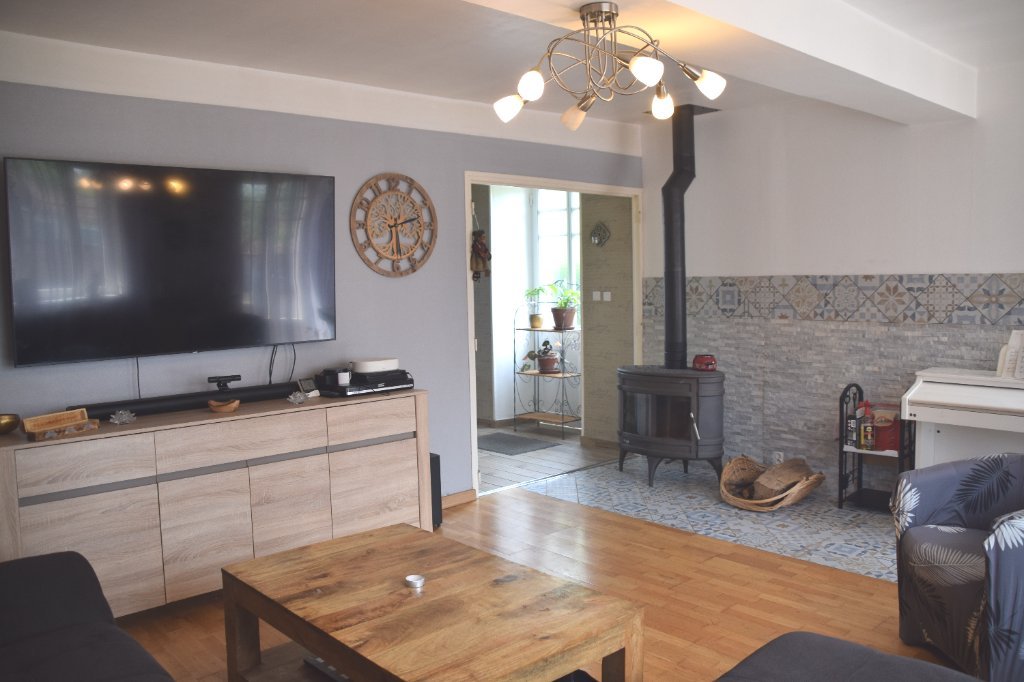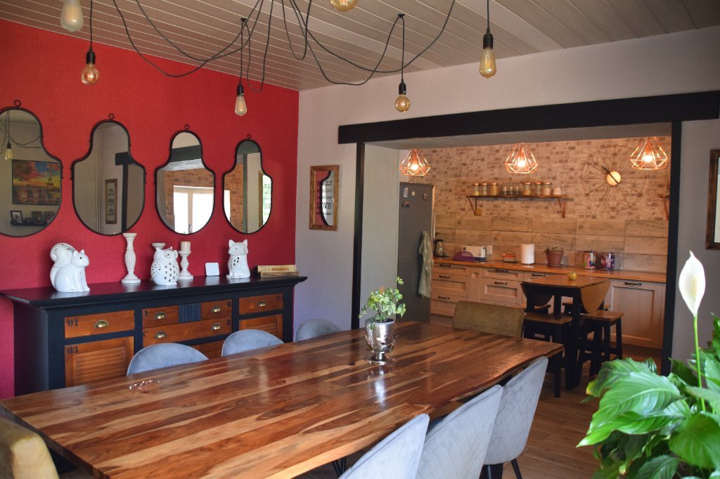 Un salon lumineux équipé d'un poêle à bois, une vaste cuisine aménagée et équipée très fonctionnelle, ouverte sur salle à manger donnant sur une terrasse.
