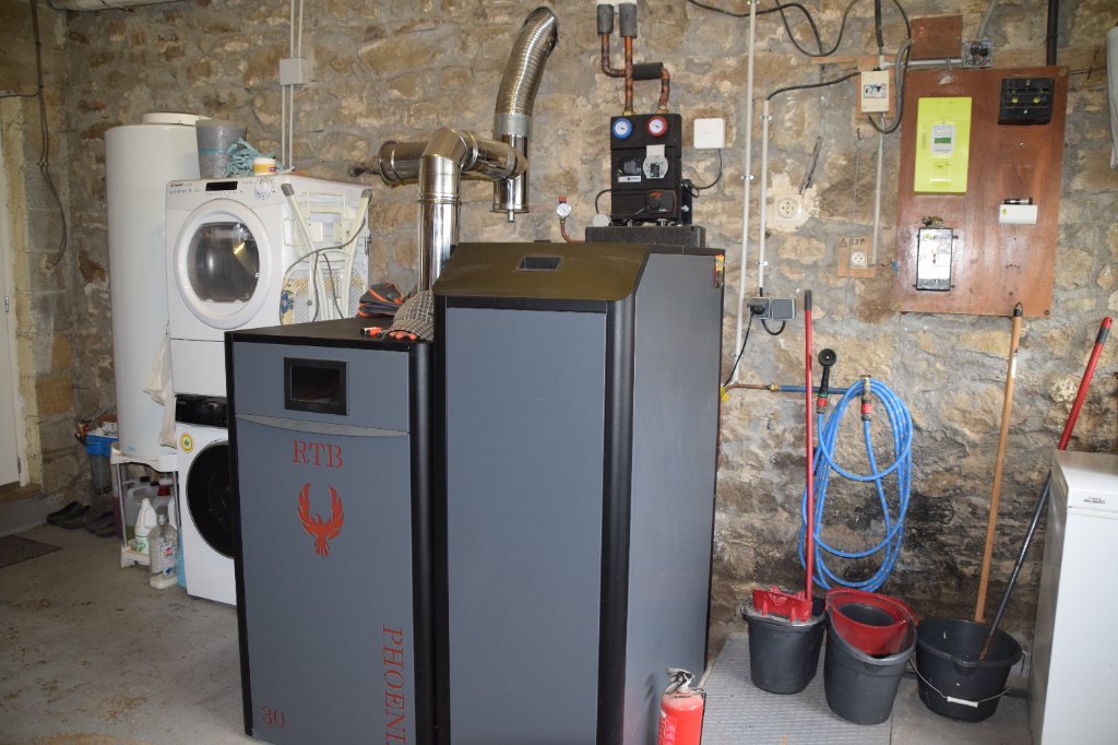 Dans la chaufferie, une chaudière à granulés neuve, un chauffe-eau électrique neuf, un espace buanderie.