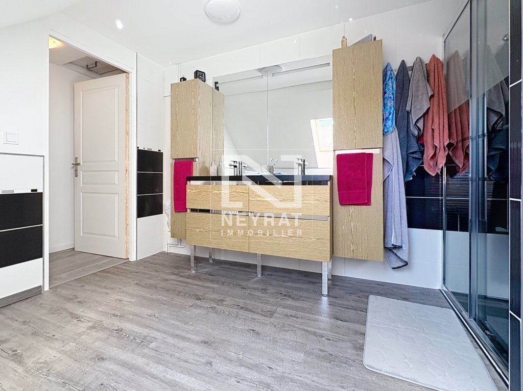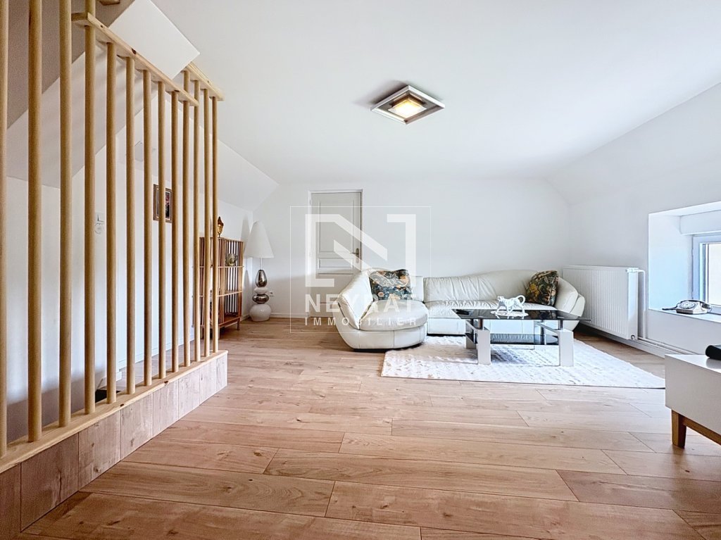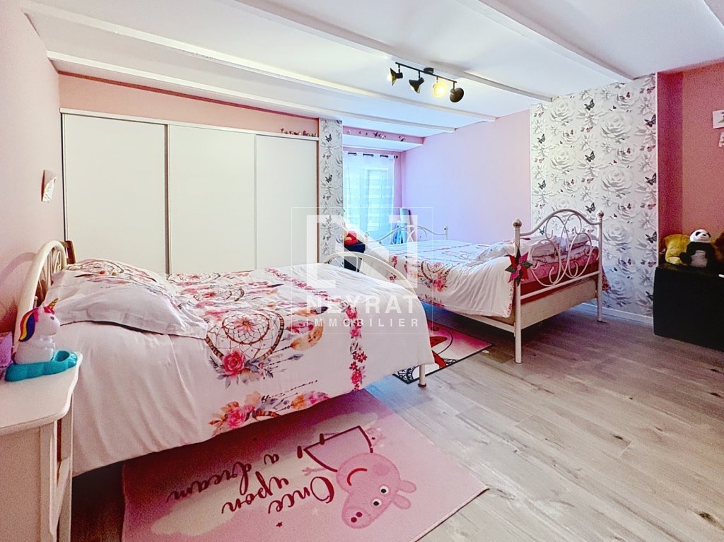 A l'étage, un séjour lumineux, deux grandes chambres avec rangements, une salle de douches, un wc et un grenier.