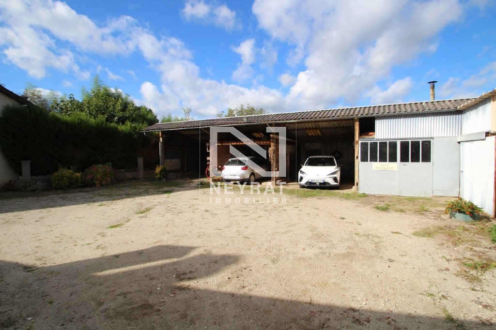 D'un côté de la route, vous arrivez sur une cour offrant un puits, trois places de parking couvertes, un atelier et une salle de réception.