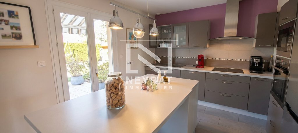 Puis la maison s'ouvre sur un espace de vie chaleureux. Le poêle à pellets crée une atmosphère douce en hiver, tandis que les larges ouvertures laissent entrer la lumière et prolongent naturellement les espaces vers le jardin. La cuisine équipée, ouverte sur la pièce de vie et avec un accès direct à la terrasse, s'intègre parfaitement à l'ensemble et constitue un lieu central, à la fois fonctionnel et agréable à vivre.