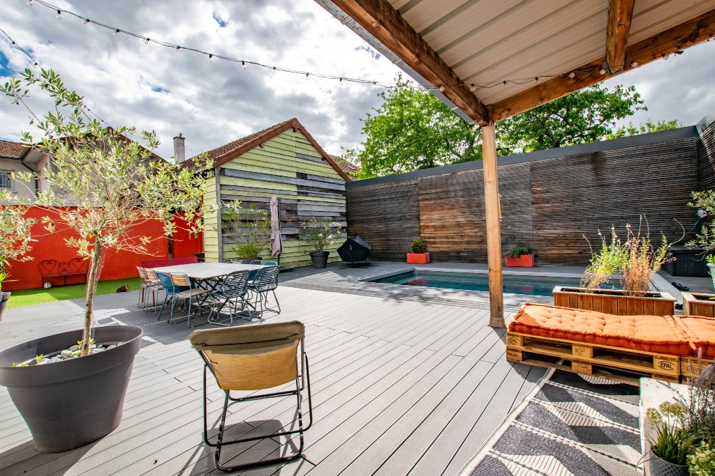 A l'extérieur une cour donnant sur un patio avec jardin suspendu vous conduira à une terrasse de 200 m2 avec une piscine chauffée ainsi qu'une dépendance et un bûcher