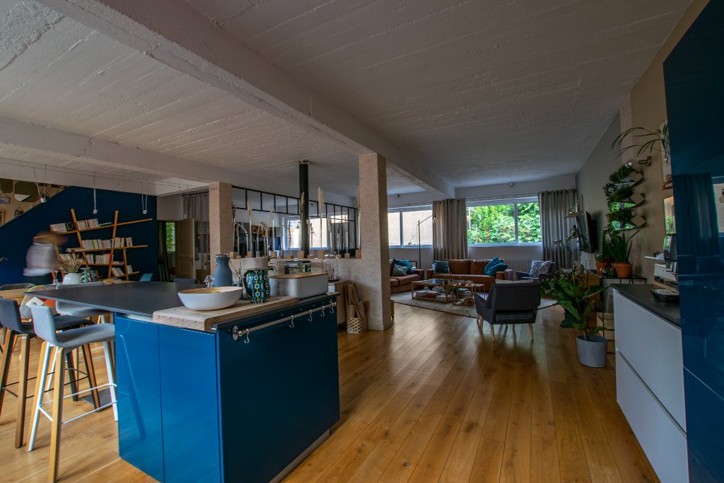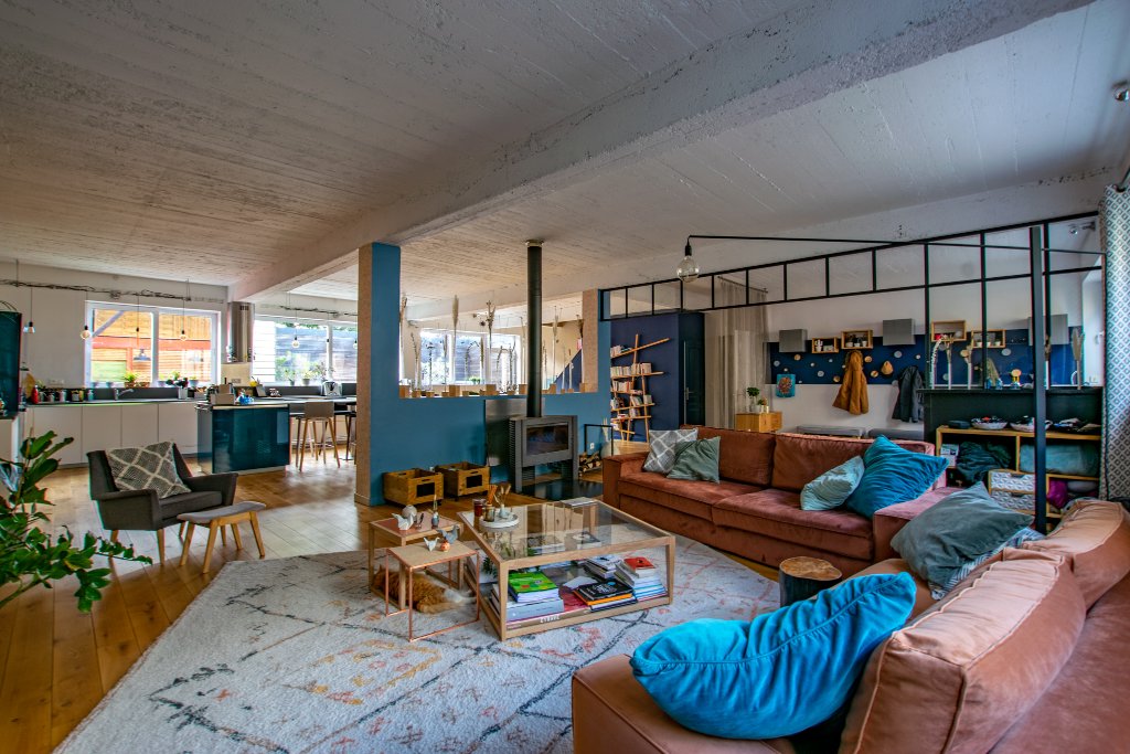 - d'une entrée donnant sur une grande pièce principale d'env 120 m2 dotée d'un agréable poêle à bois central, et dans la continuité sa cuisine équipée.
