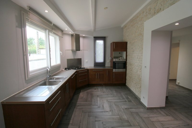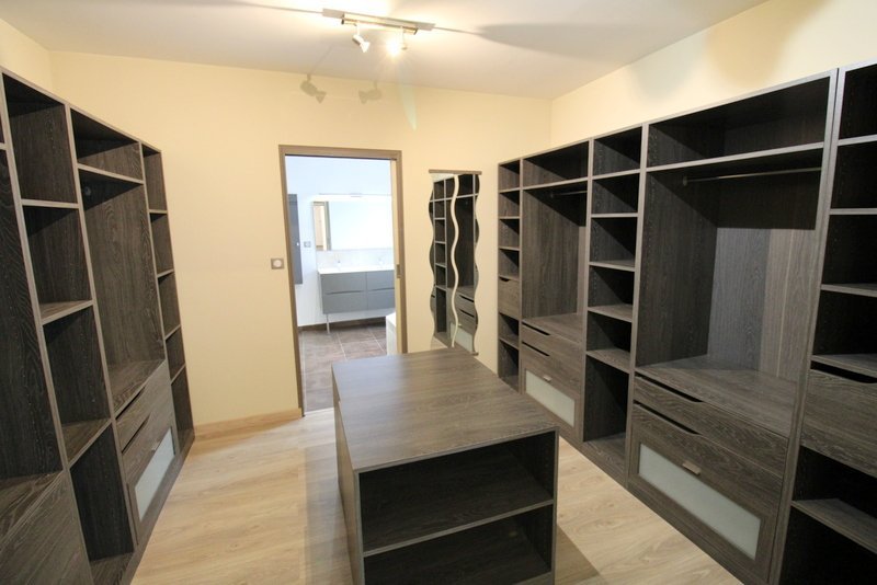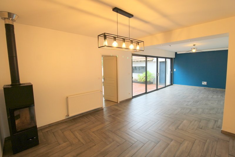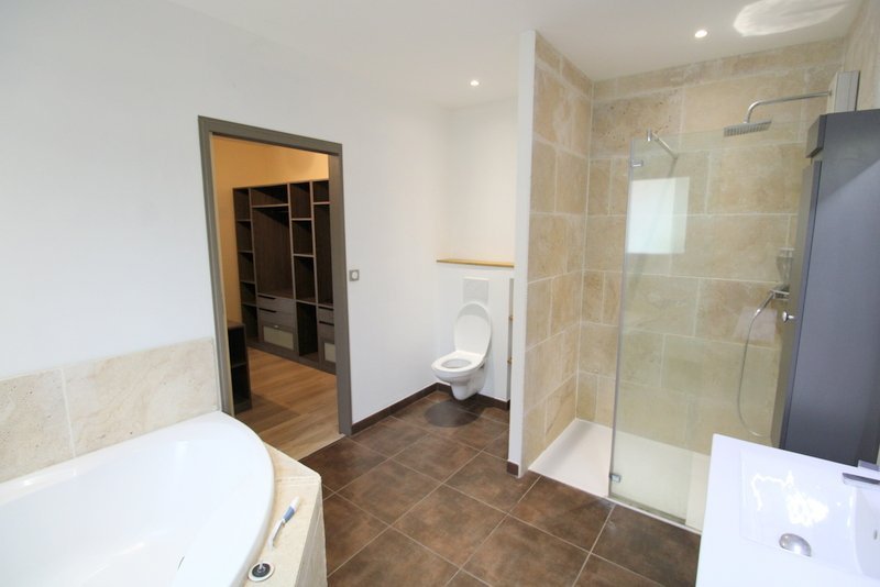 Elle comprend au rez-de-chaussée une entrée, un wc, un bureau, une salle d'eau, une cuisine, un cellier/buanderie, un grand salon / salle à manger de plus de 44 m2, une chambre parentale avec dressing et une salle d'eau avec baignoire et douche.