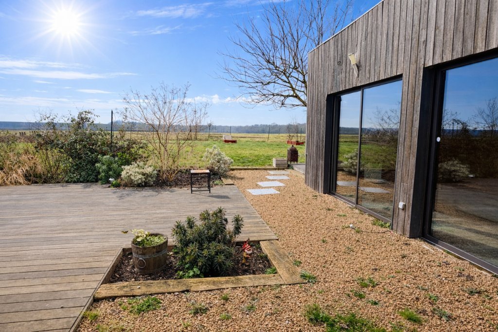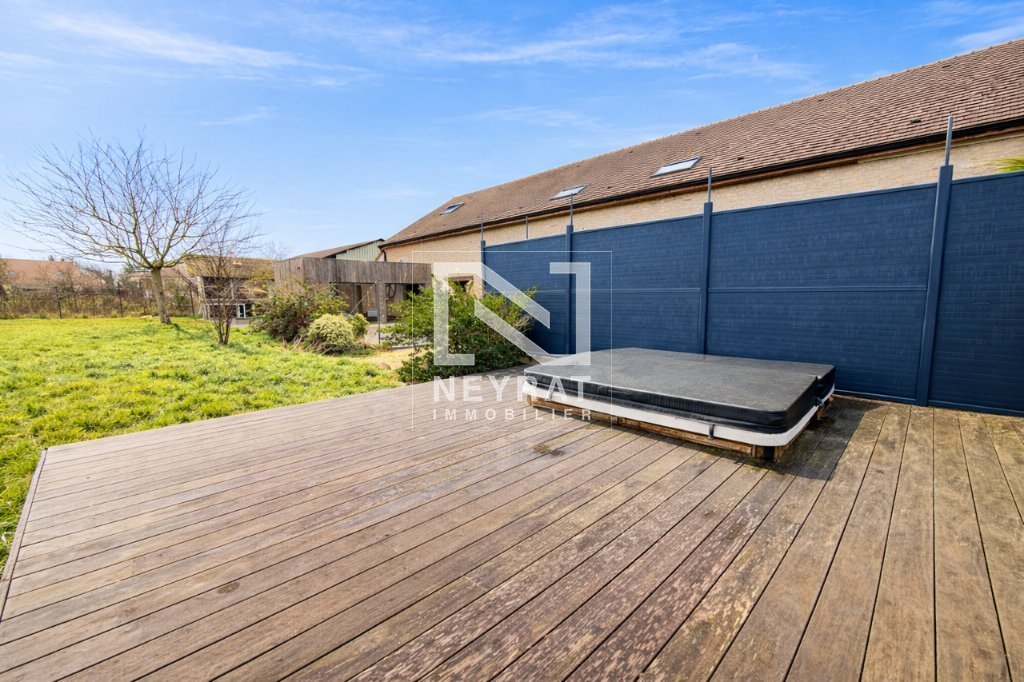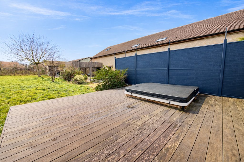 À l'arrière, un véritable écrin de tranquillité avec grande terrasse en bois, espace jacuzzi, coin barbecue et plusieurs zones de détente pensées pour profiter pleinement des beaux jours.