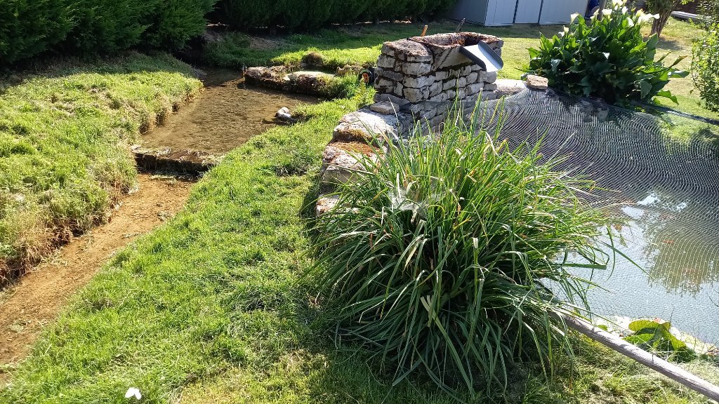 Un bassin aménagé dans un jardin clos et arboré, bordé d'une source.