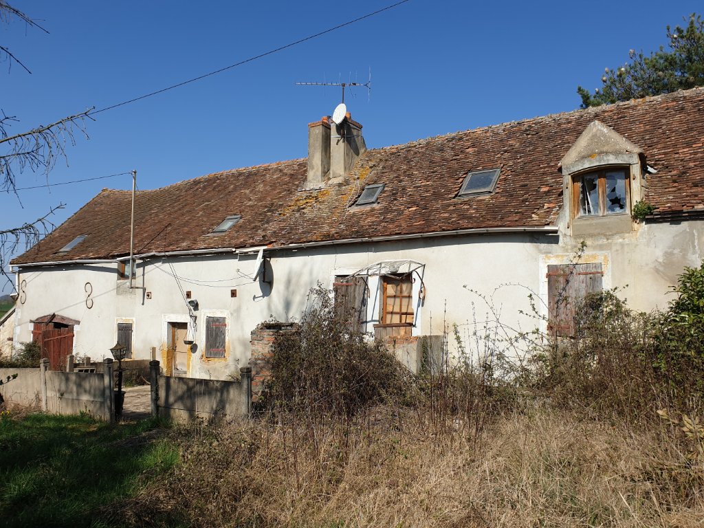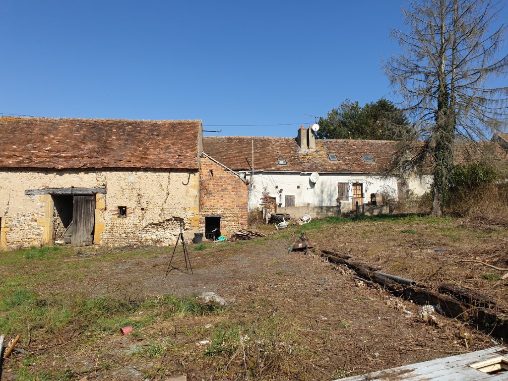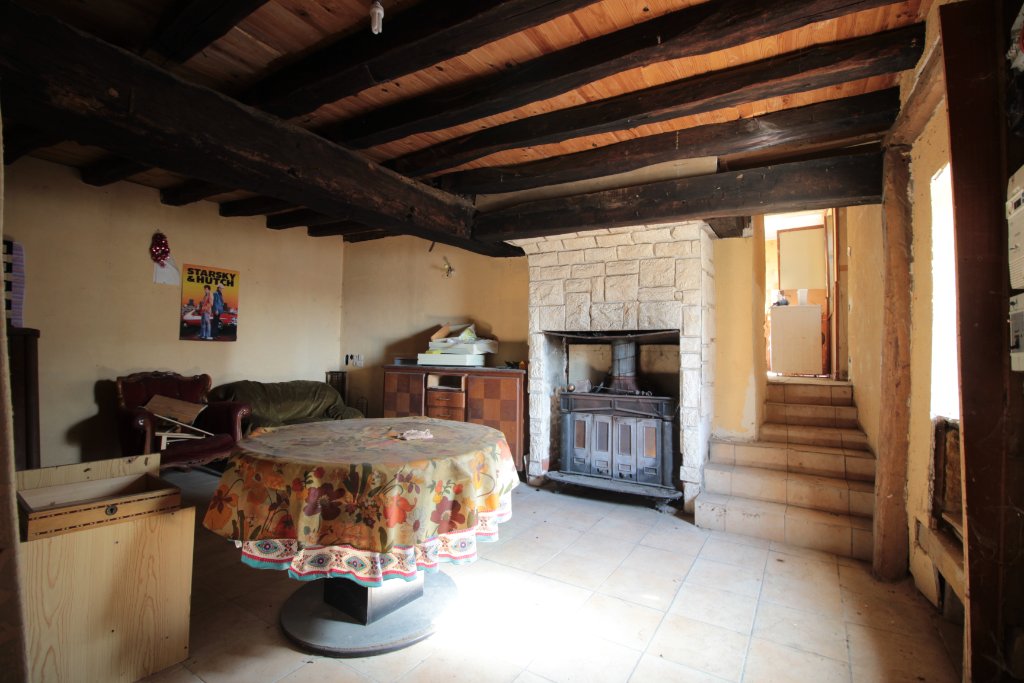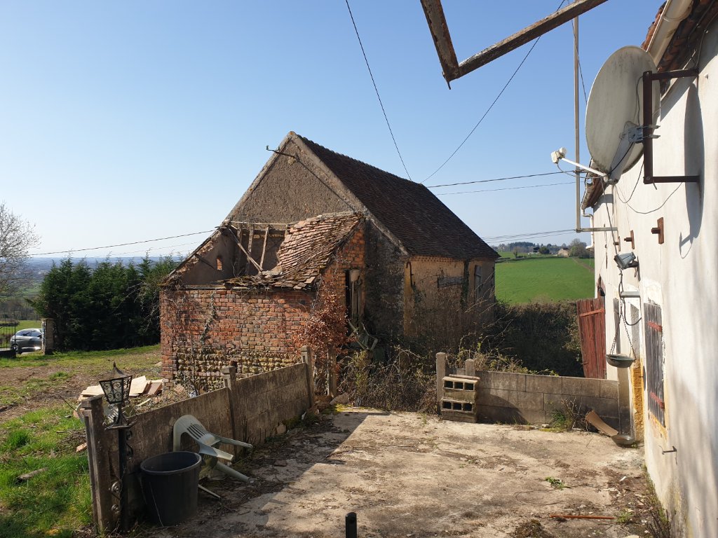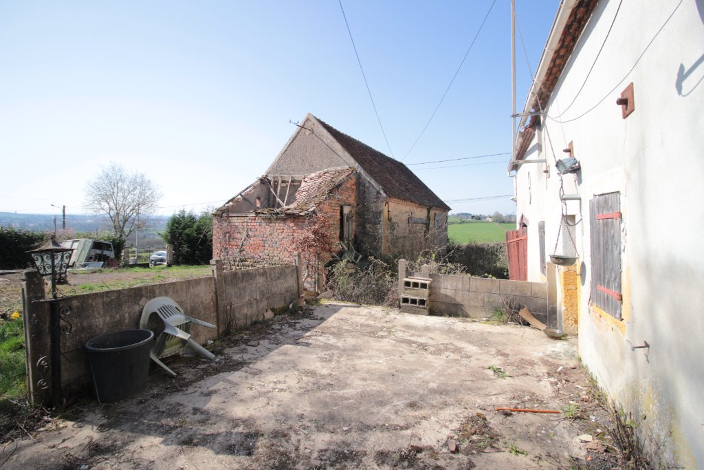 Au calme de la campagne, à 3 km des commodités et commerces, fermette mitoyenne à rénover entièrement, comprenant une cuisine semi-ouverte sur la salle à manger, un salon, un cellier, une salle de bains avec WC, une pièce palière. Combles distribués en mezzanine et trois chambres. Une grange attenante avec four à pain. Une seconde grange indépendante. Cave avec puits.