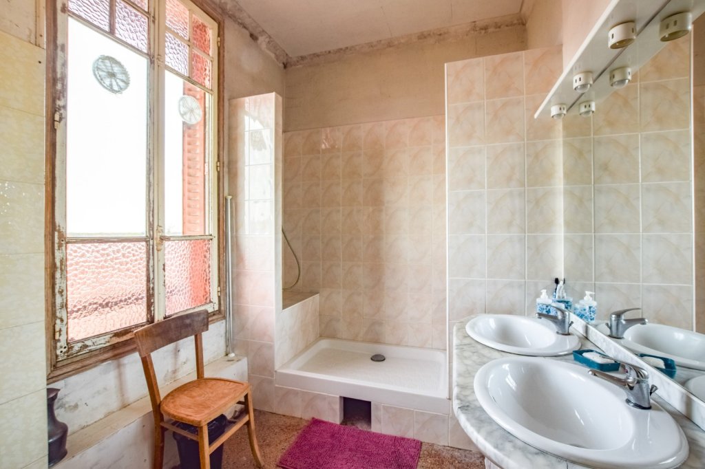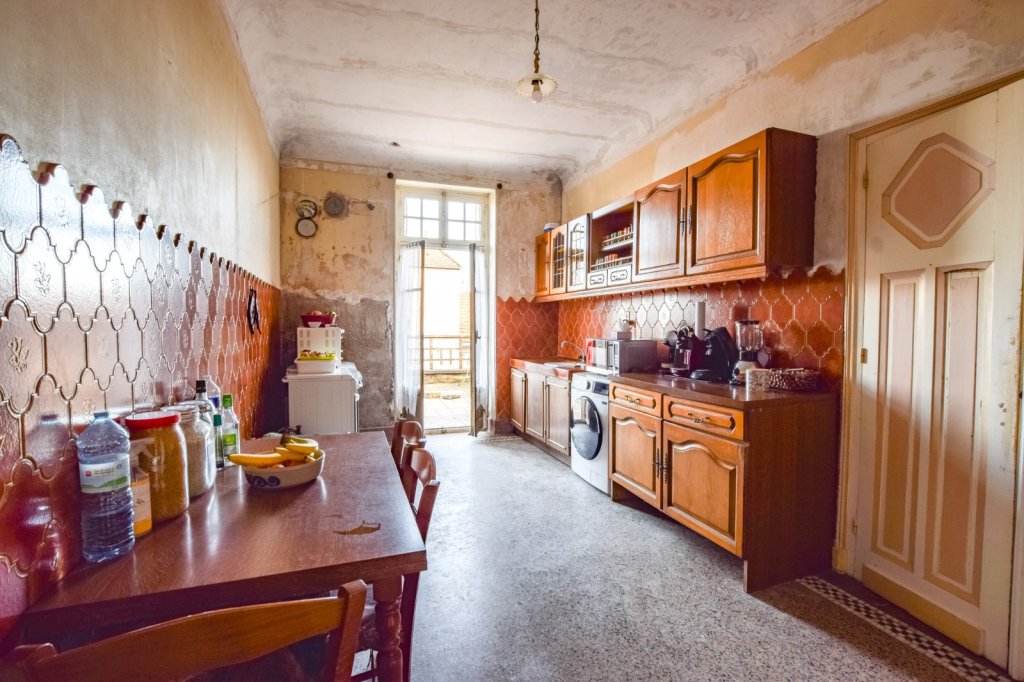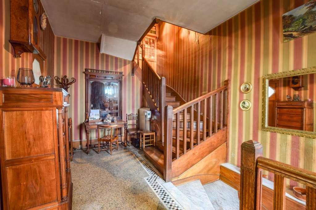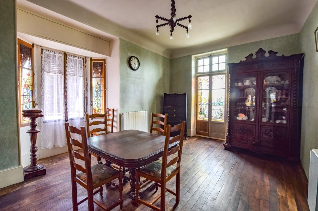 Dès l'entrée, un hall accueillant vous mène vers un salon agrémenté de fenêtres ornées de vitraux, qui ajoute une touche authentique à la pièce, quant à la cuisine, elle s'ouvre sur une vaste terrasse de 29 m², idéale pour profiter des beaux jours.
