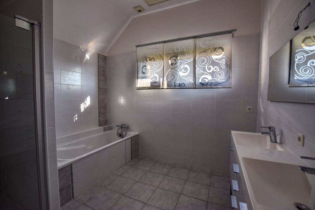 Au rdc, l'entrée dessert une vaste pièce principale, une cuisine équipée, une chambre avec une salle de douche privative, un wc, une buanderie-chaufferie,et l'accès au garage double.