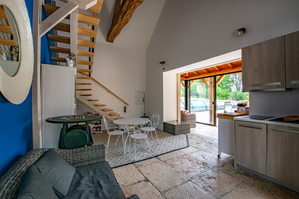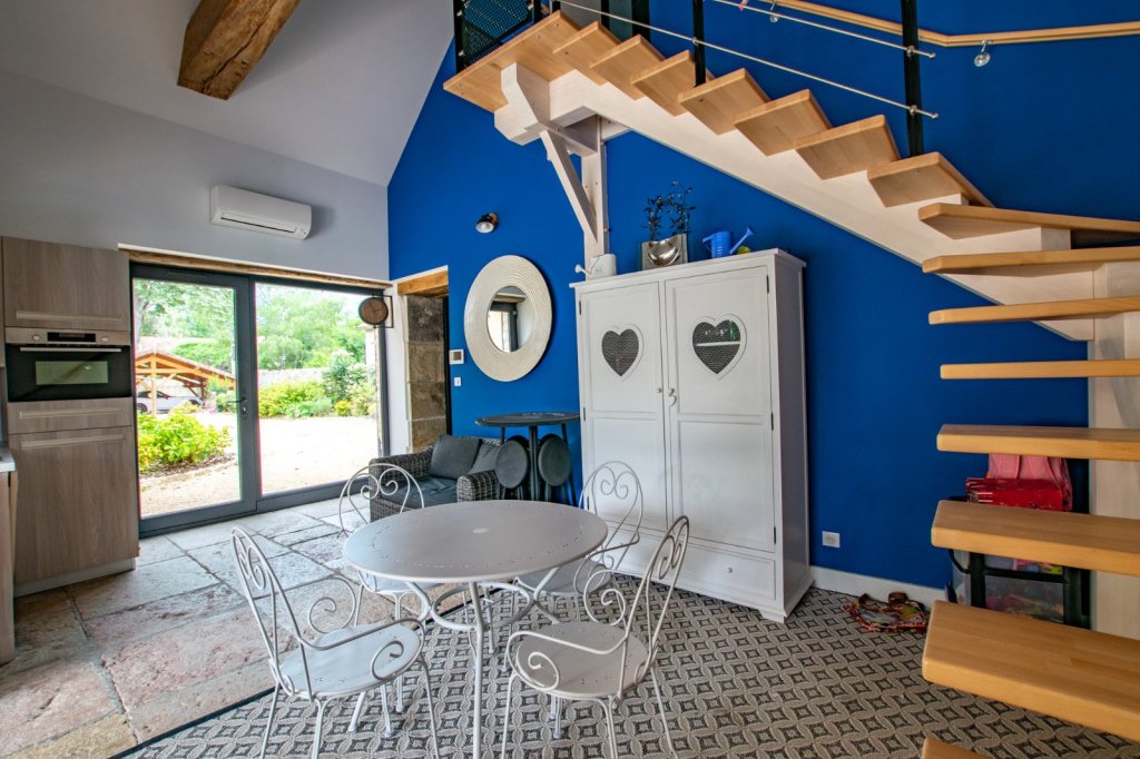 L'accès à l'intérieur se fait par un bel escalier en pierre, dévoilant la première partie de cette demeure. Vous y découvrirez une lumineuse pièce de vie, une cuisine équipée avec son îlot central et une vaste terrasse, parfaite pour des moments conviviaux en famille ou entre amis. Un cellier et des toilettes complètent ce niveau. À l'étage, une chambre parentale avec salle de bains et dressing, une chambre supplémentaire et une salle de bains avec toilettes.