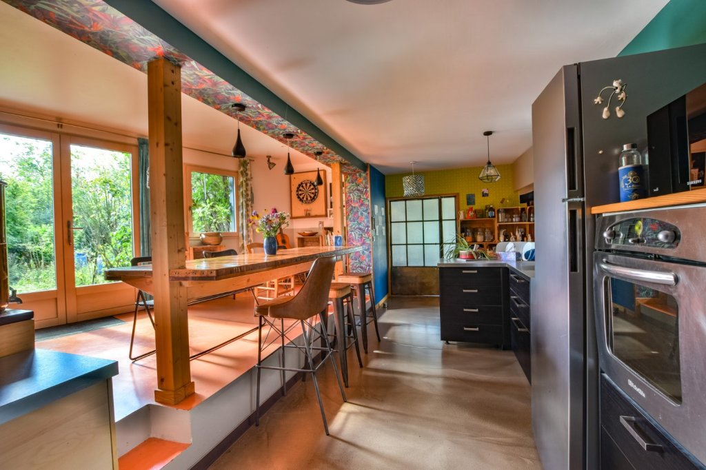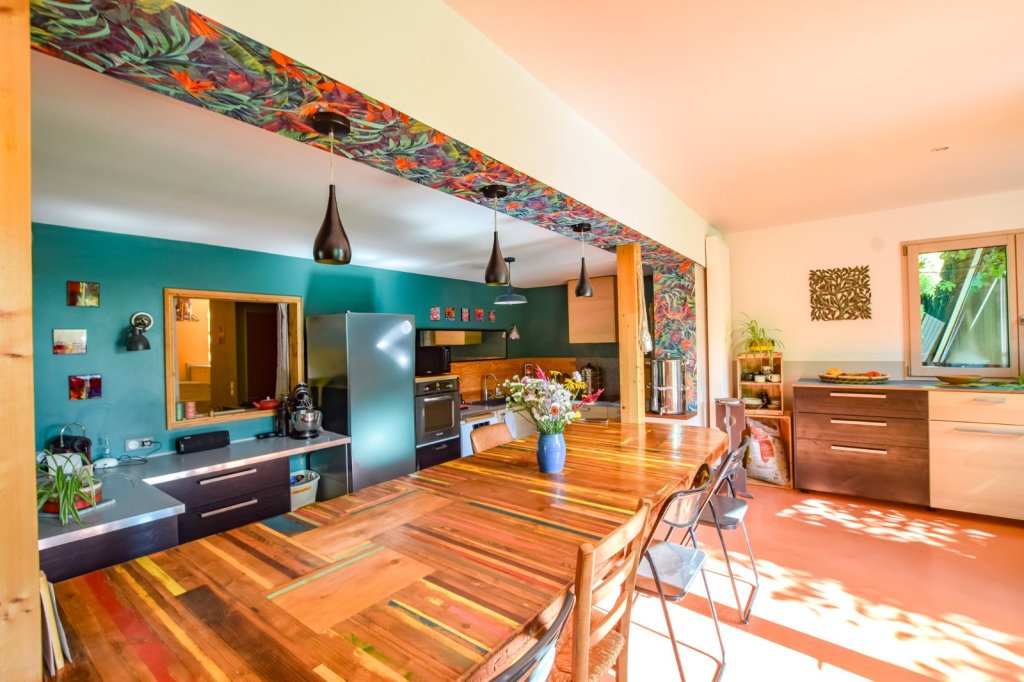 - une grande cuisine équipée avec coin repas ouvrant sur une terrasse et son accès directe au jardin,