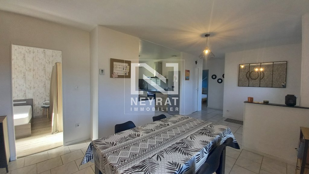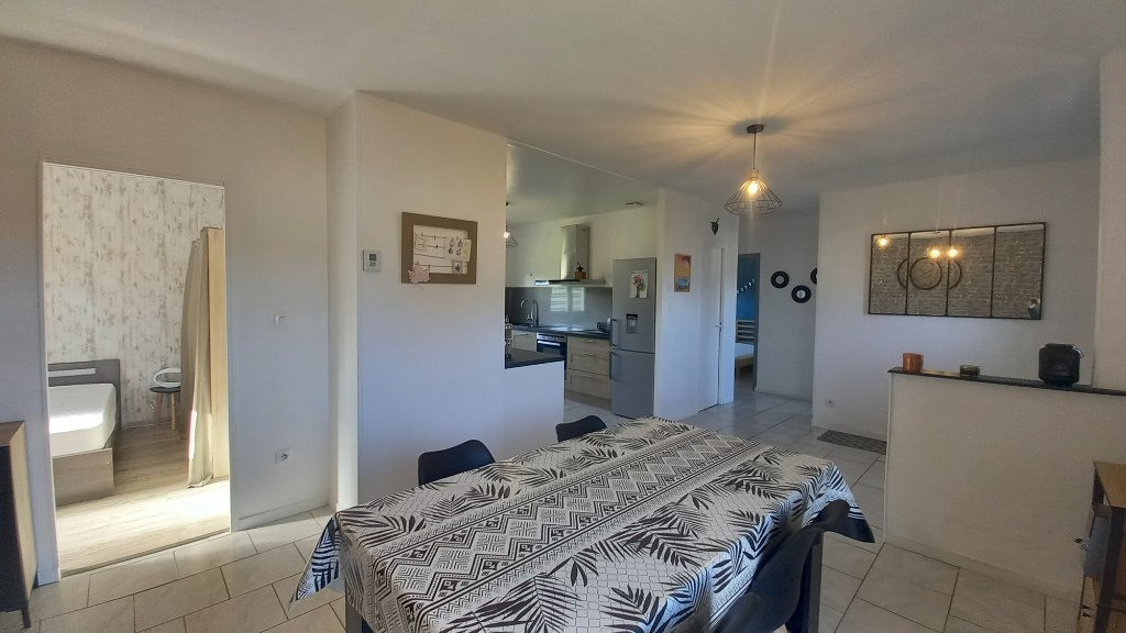 Une entrée, séjour ouvert sur une cuisine aménagée.