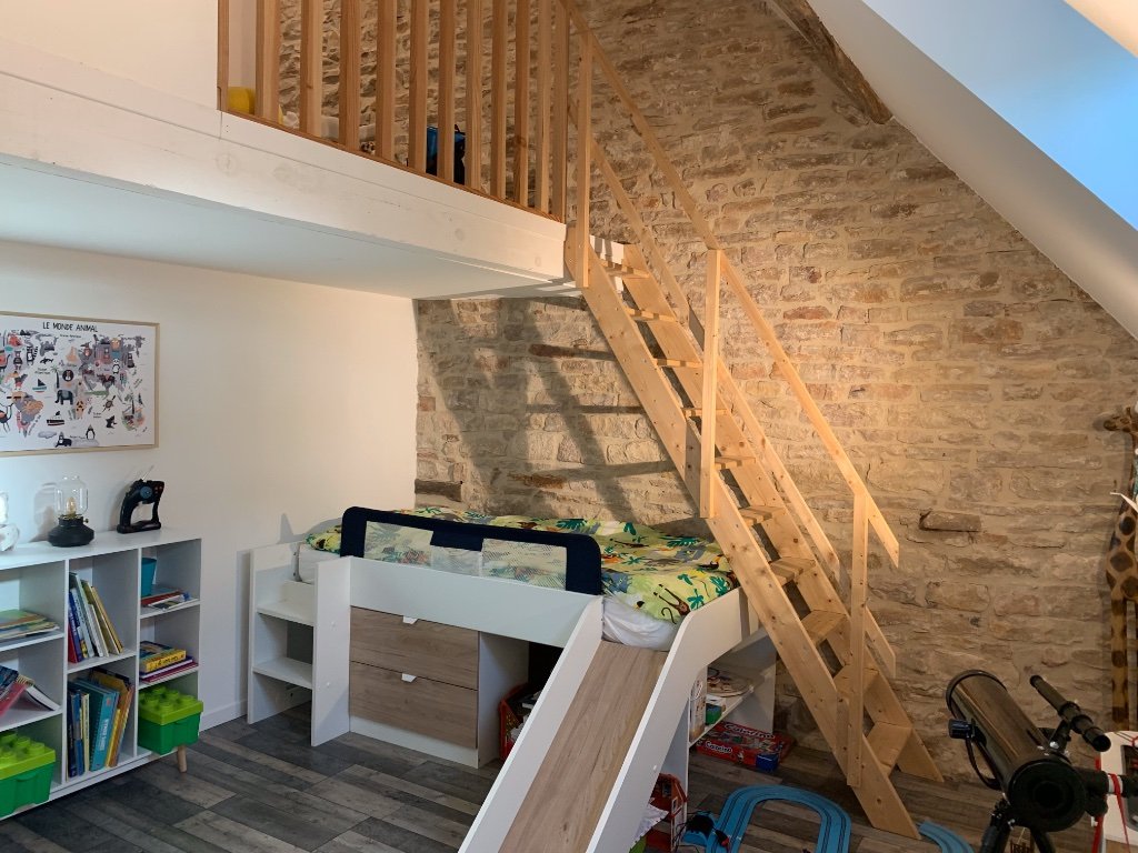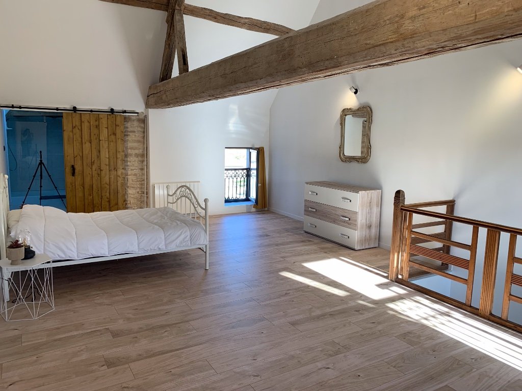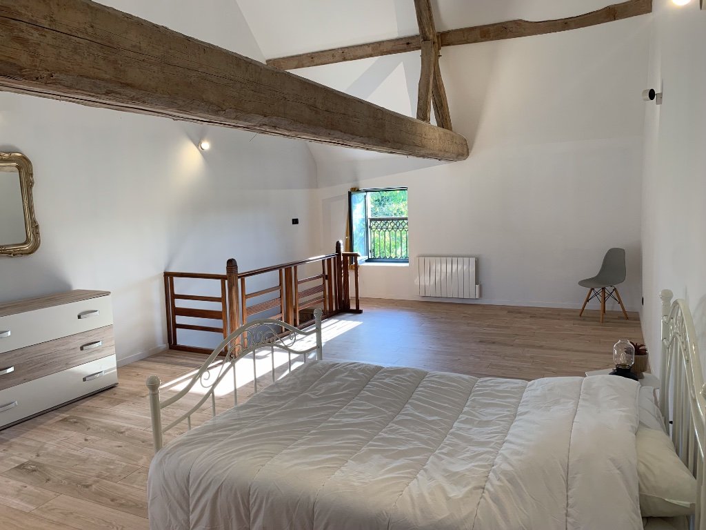 À l'étage, un palier distribue 3 chambres: 2 chambres avec chacune une mezzanine, et une chambre parentale et dressing, avec murs en pierres et charpente apparente, équipée Home Cinéma, une salle de bains double et un WC séparé.