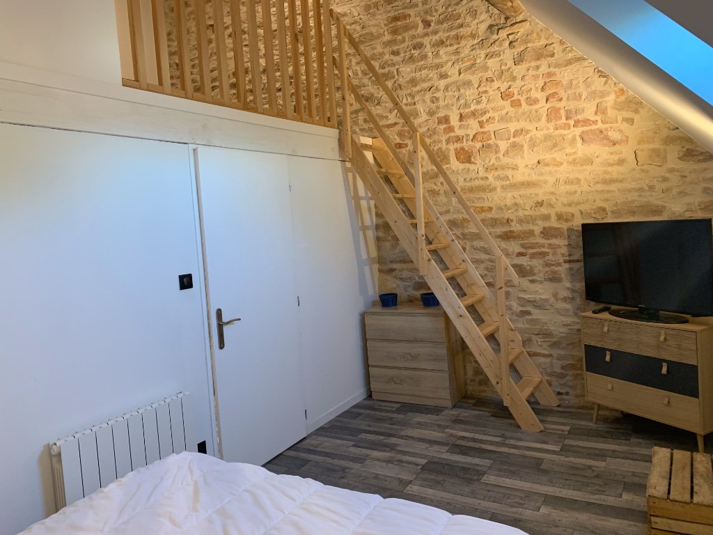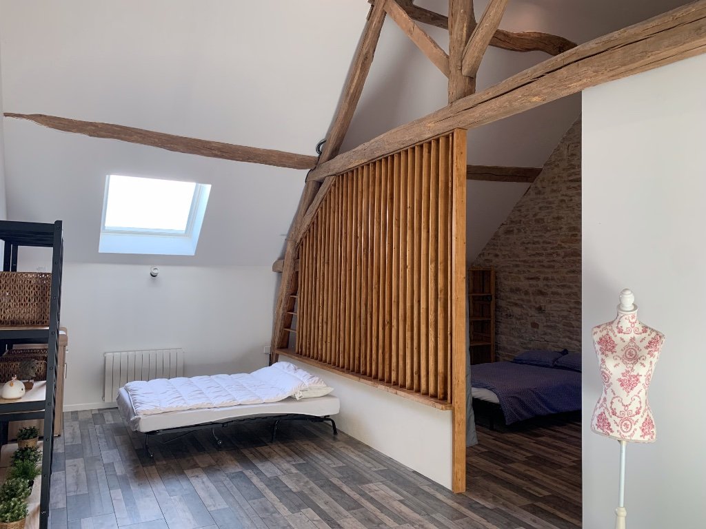 On y retrouve une pièce de vie avec poêle à bois, une buanderie qui peut être transformée en cuisine et une chambre. Au second étage, une grande et magnifique chambre sous charpente et une salle d'eau douche à l'italienne XXL et un WC.