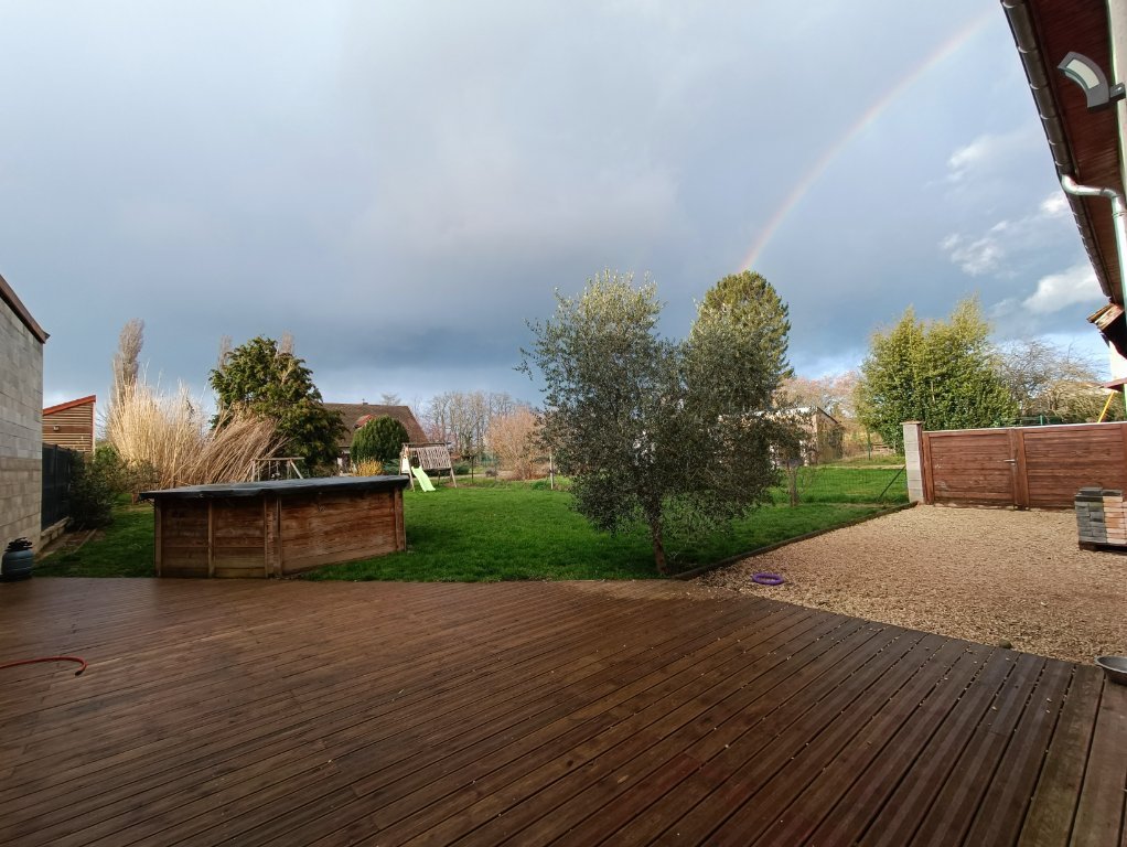 A l'arrière, jardin avec grande terrasse bois, piscine , tobogan et balançoire.