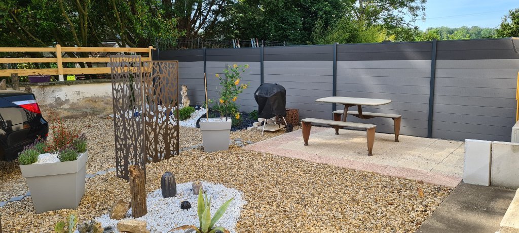 Une cour à l'avant de la maison d'une superficie de 188m², aménagée et orientée sud-est, vous permet de profiter de l'extérieur sans les contraintes d'un jardin, avec une cave pour plus de rangement.