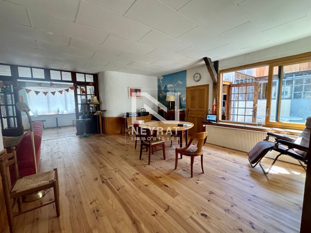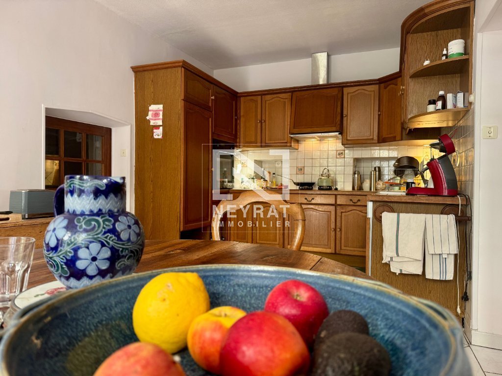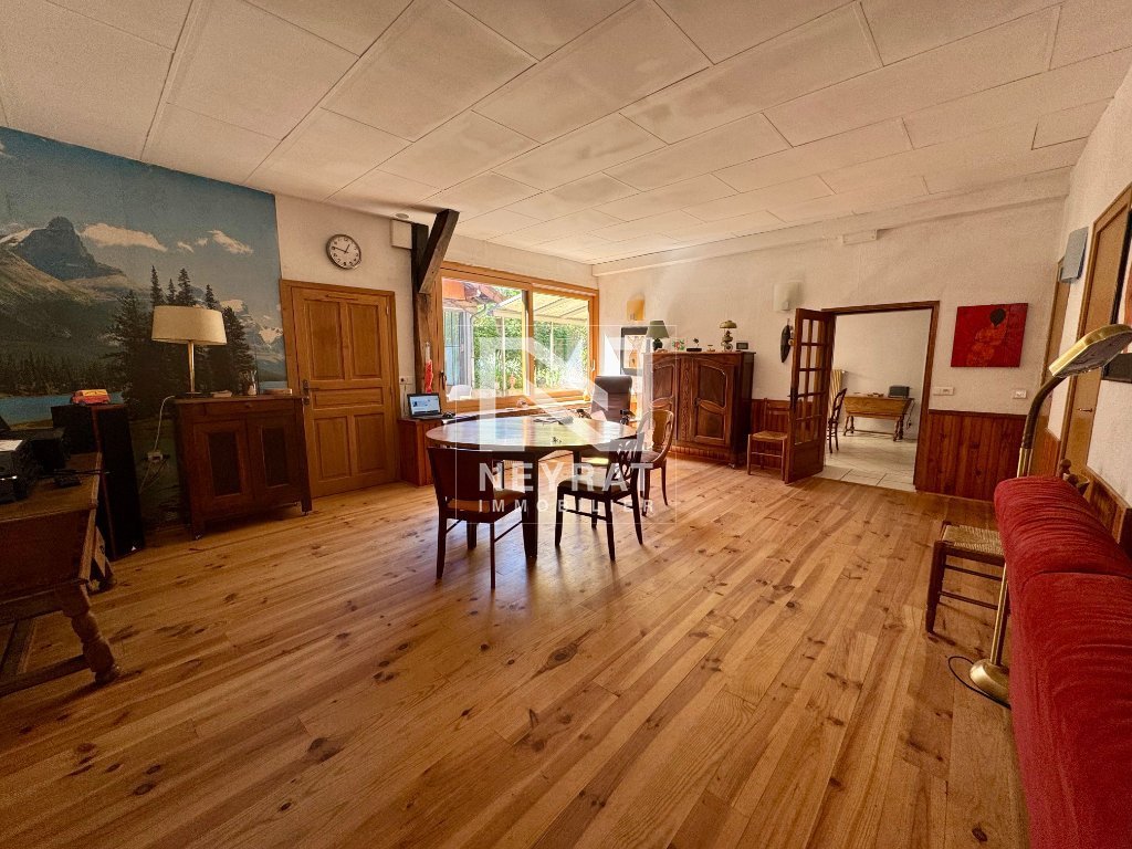 Dès l'entrée, la maison s'ouvre sur un vaste salon-séjour lumineux, marqué par un coin cheminée et un insert bois. Le parquet massif et les poutres apparentes apportent du caractère, tandis qu'une grande baie vitrée laisse entrer la lumière du jardin. La pièce de vie se prolonge par une cuisine équipée et aménagée, qui donne directement accès à la terrasse et au jardin, avec en complément un vaste cellier et une cave.