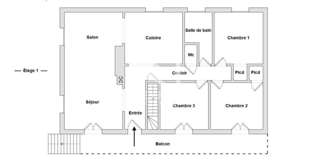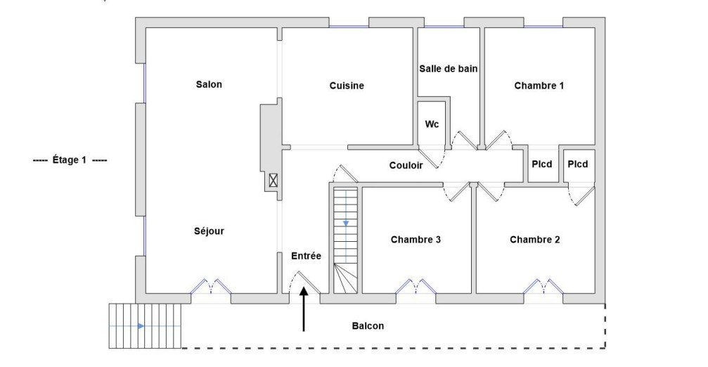 L'espace de vie se situe au 1er étage et accueille une entrée avec rangements, une cuisine spacieuse que l'on pourra aménager à son goût, semi-ouverte sur un salon/séjour lumineux, agrémenté d'un insert. Un dégagement dessert trois chambres, dont deux équipées de placards et donnant sur un balcon sécurisé, tout comme le salon/séjour, ainsi qu'une salle de bains et des WC séparés — un agencement fonctionnel, modulable selon vos projets (ouverture des volumes, redistribution des pièces).