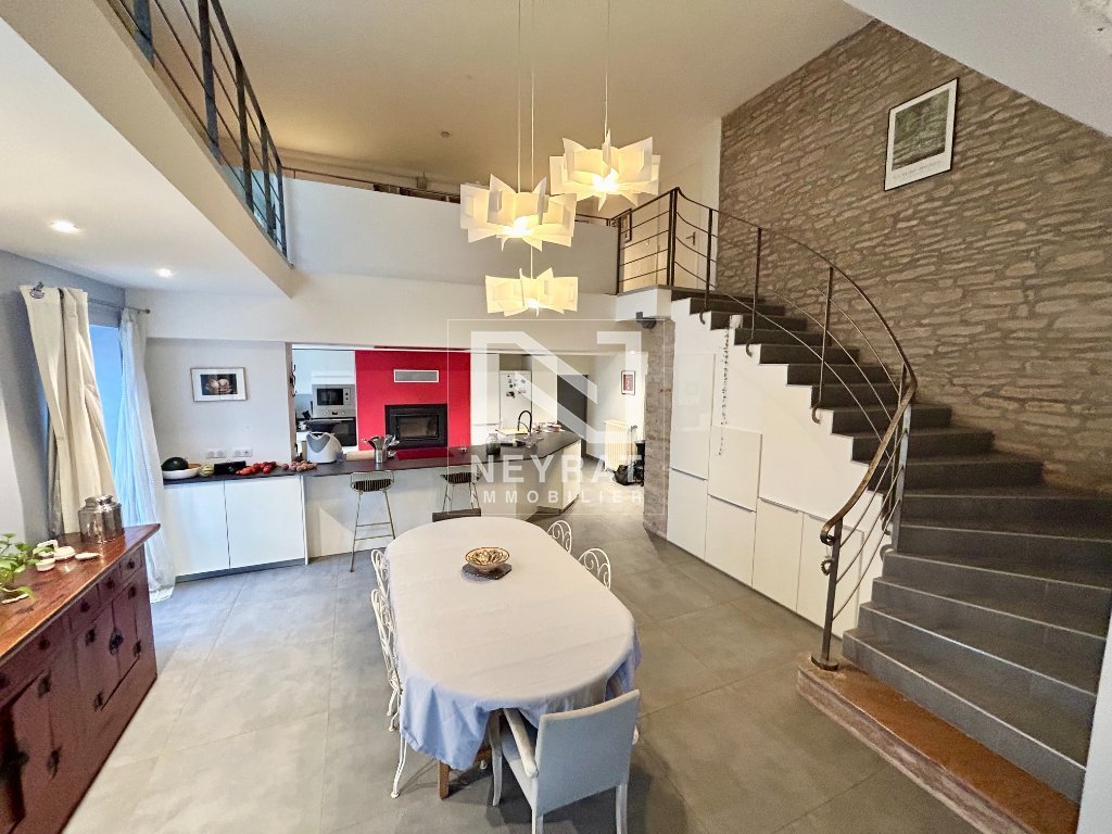 Le vaste salon lumineux, équipé d'un poêle à bois moderne, vous invite à la détente.