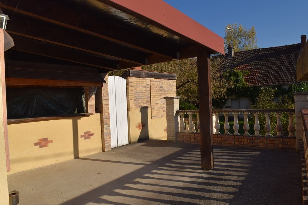 Terrasse avec barbecue, petit jardin à l'arrière et cour fermée à l'avant.