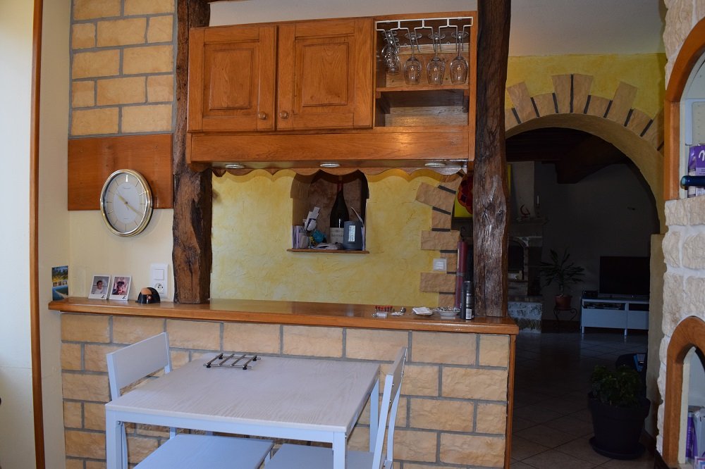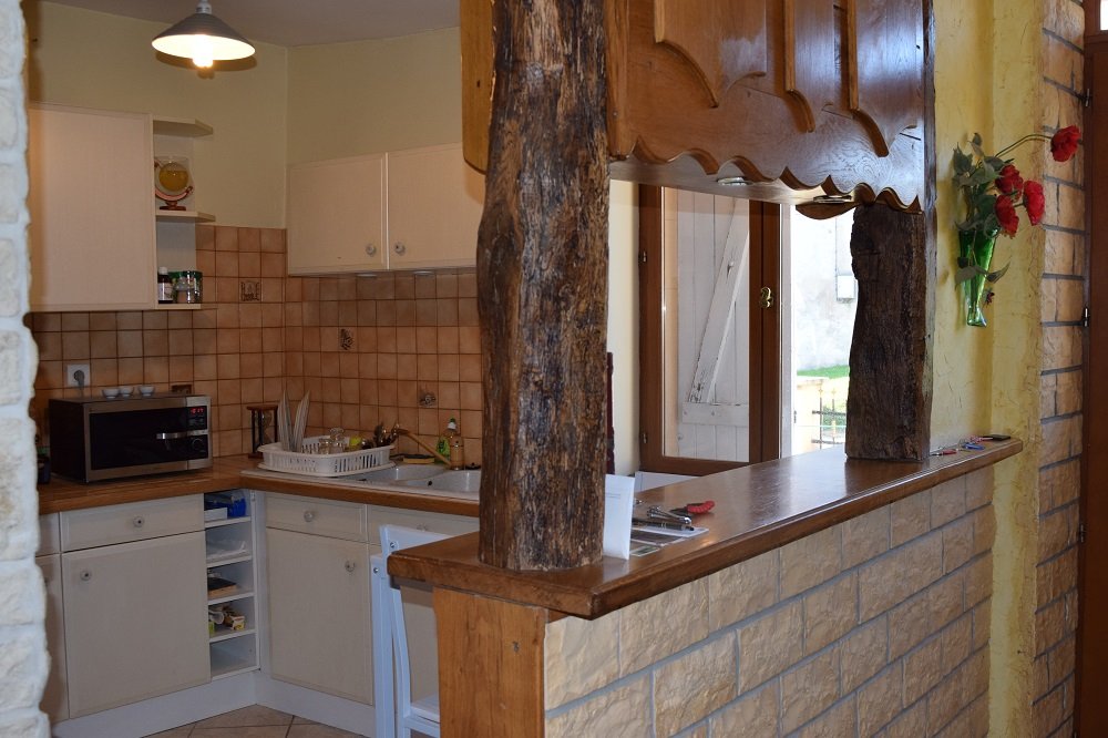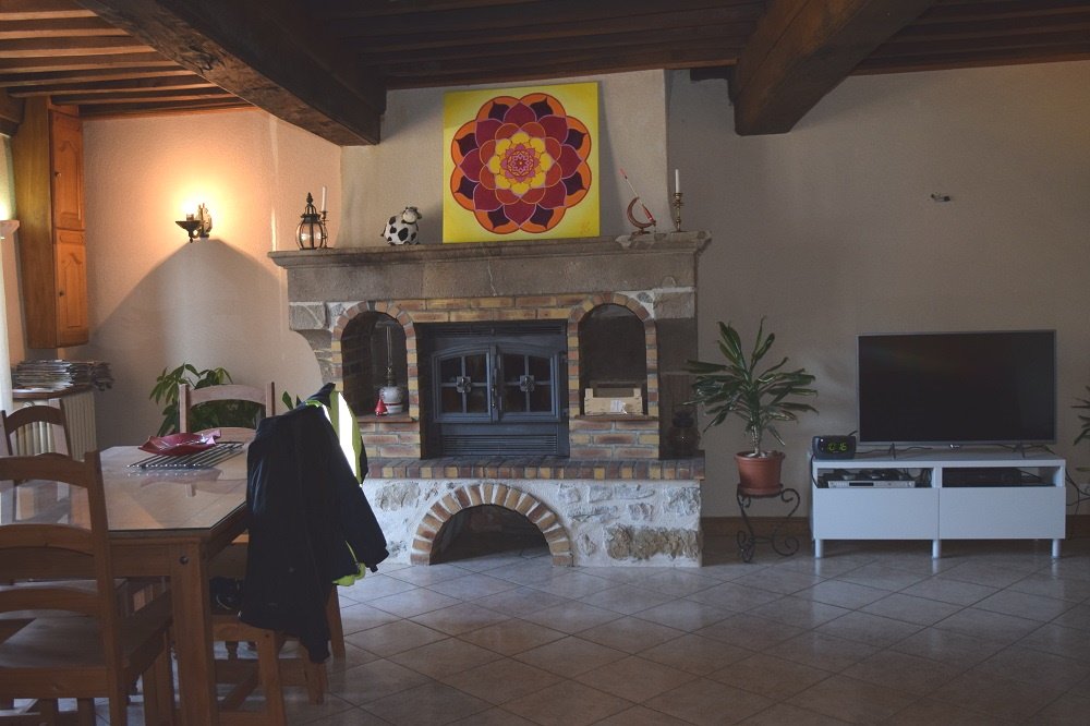 - Une habitation de plain pied d'environ 85 m², entrée et couloir, un séjour avec cheminée, une cuisine aménagée semi-ouverte sur le couloir, une salle de bains, 2 chambres, WC, rangement.
