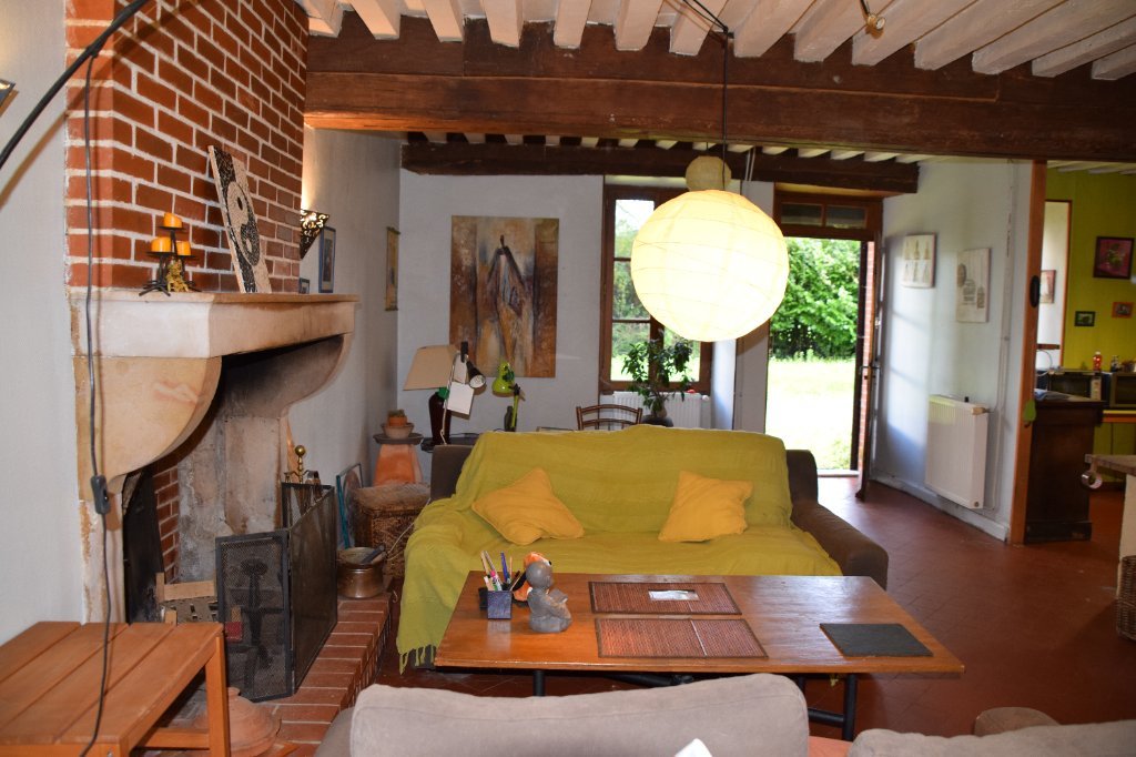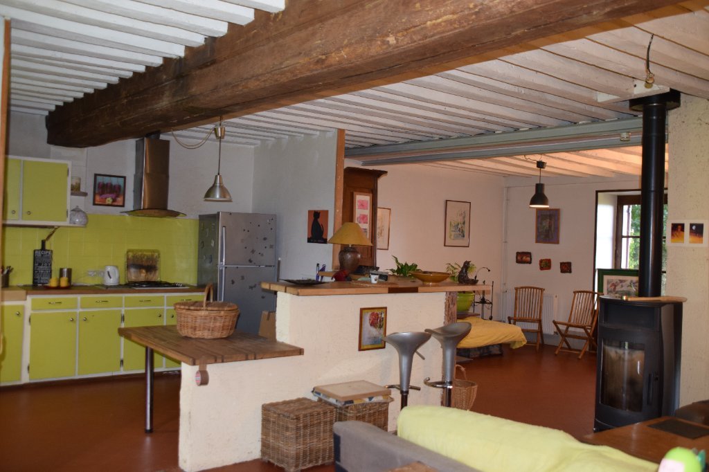 Une grande pièce de vie d'environ 70 m² : salon-séjour avec poêle à bois, une cuisine aménagée ouverte, accès direct sur l'avant et l'arrière de la maison.