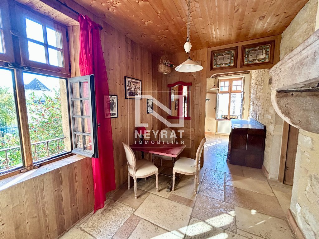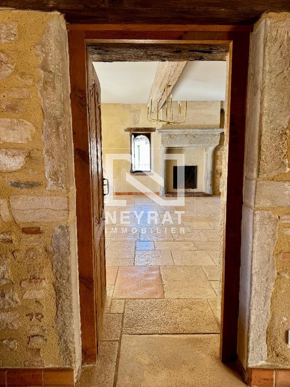Le duplex, accessible depuis un vaste vestibule chargé d'histoire, s'élève sur les niveaux supérieurs. Un escalier en bois conduit au premier étage où s'ouvre une entrée généreuse agrémentée d'une belle pierre de cheminée historique. La cuisine aménagée bénéficie d'une vue directe sur la silhouette monumentale de l'Abbaye. Le séjour, remarquable par son volume - près de 70 m² - est inondé de lumière naturelle et offre de nombreuses possibilités d'aménagement : espace de réception, salon familial et coin lecture, le tout autour d'une cheminée tubée aux proportions impressionnantes, prête à diffuser une atmosphère chaleureuse.