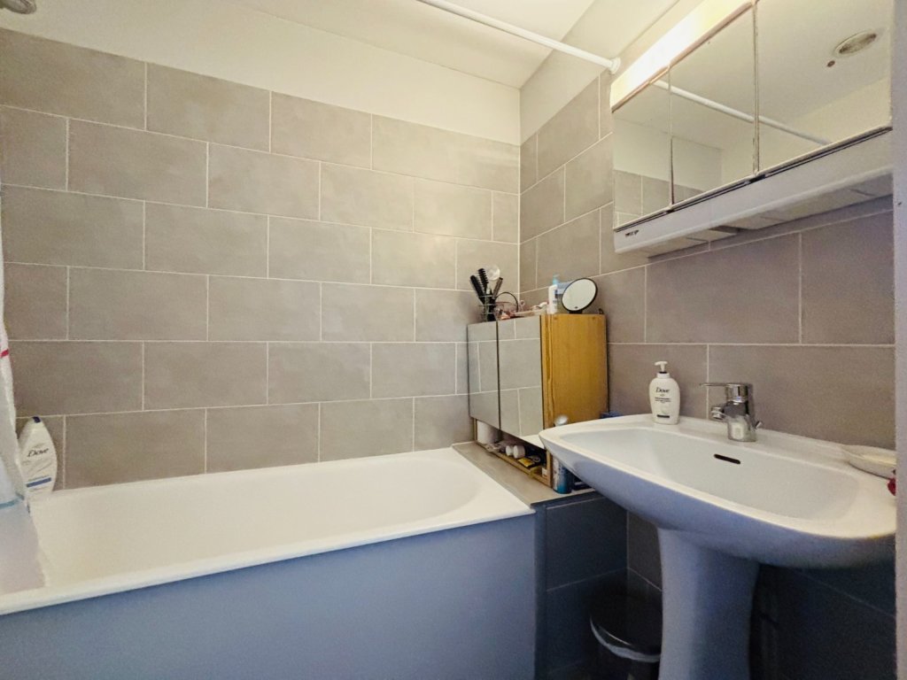 L'entrée dessert une salle de bain , ouvrant sur une pièce à vivre lumineuses grâce aux grandes ouvertures avec une kitchenette et un grand placard .
