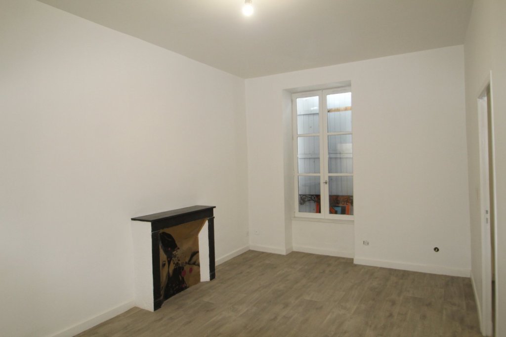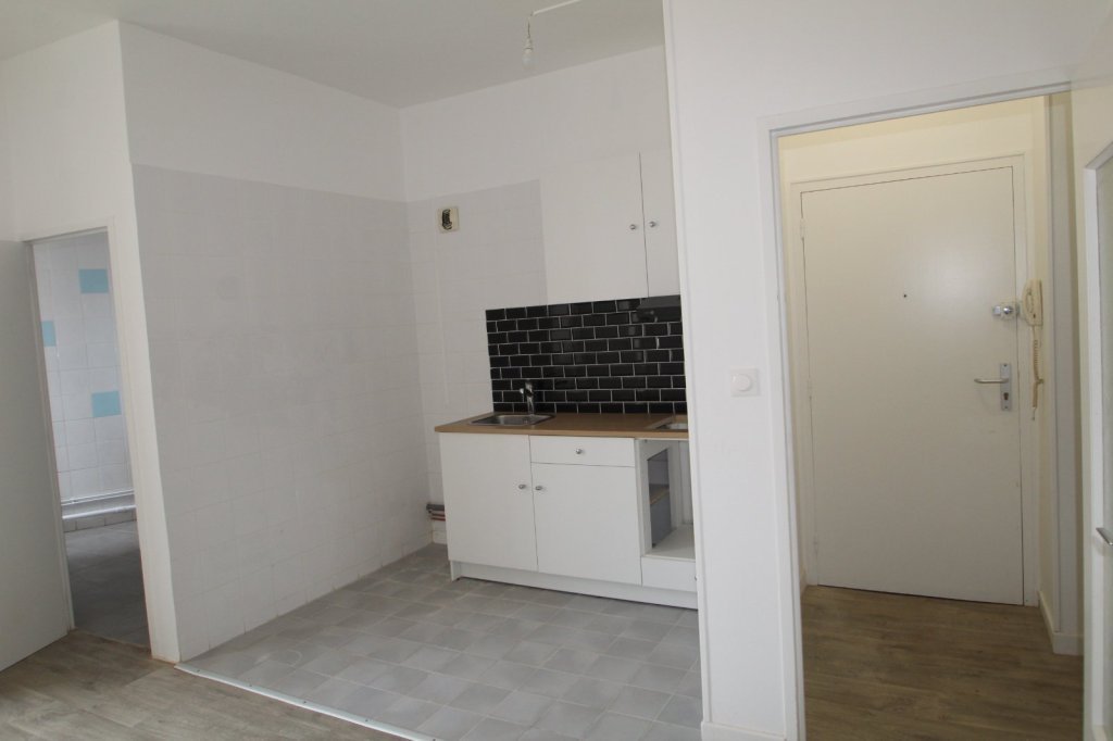 Appartement dans petit immeuble au centre ville comprenant : une entrée, une cuisine aménagée, un cellier, un séjour, une chambre, un bureau et une salle d'eau avec WC.
