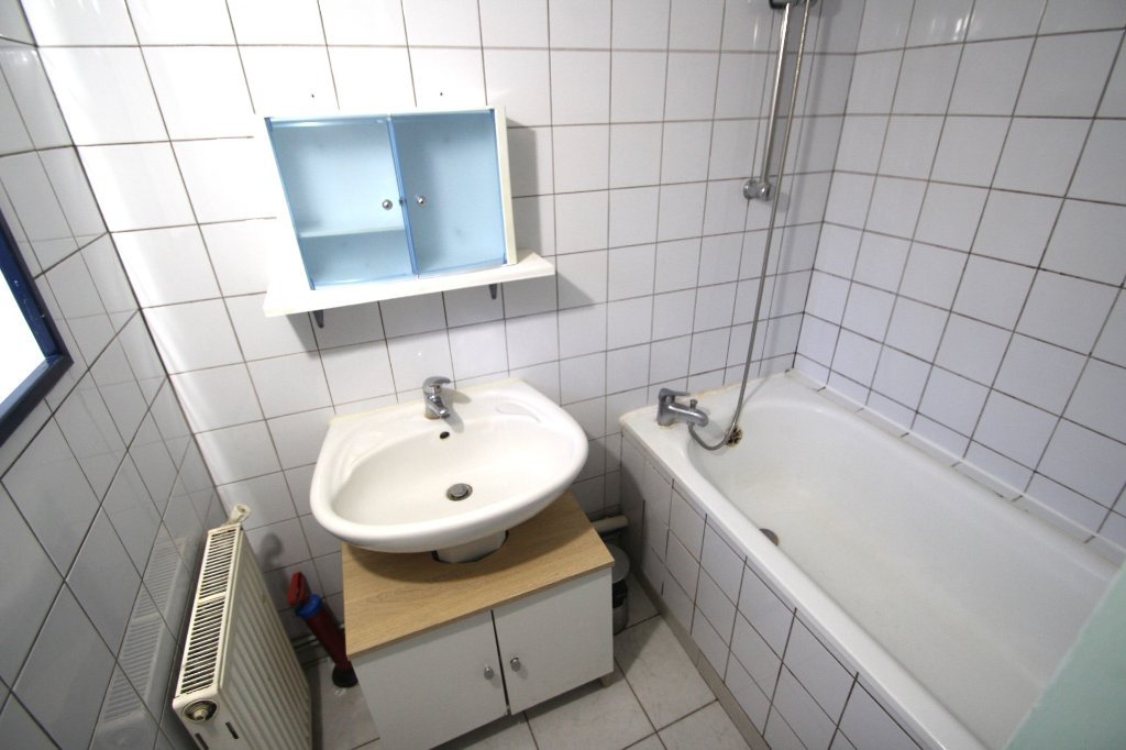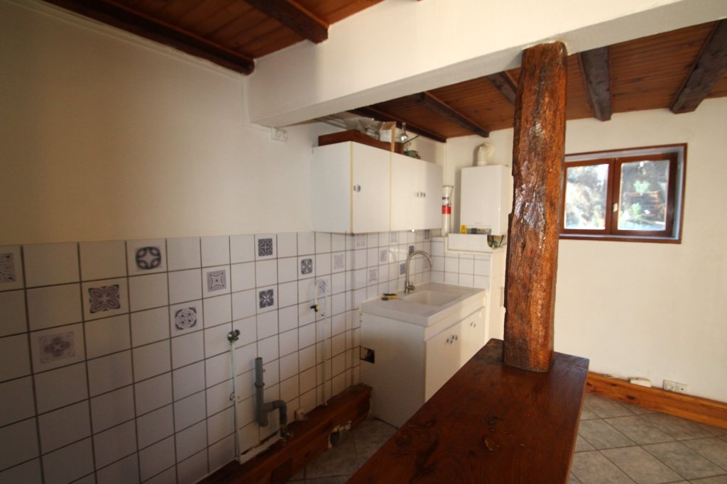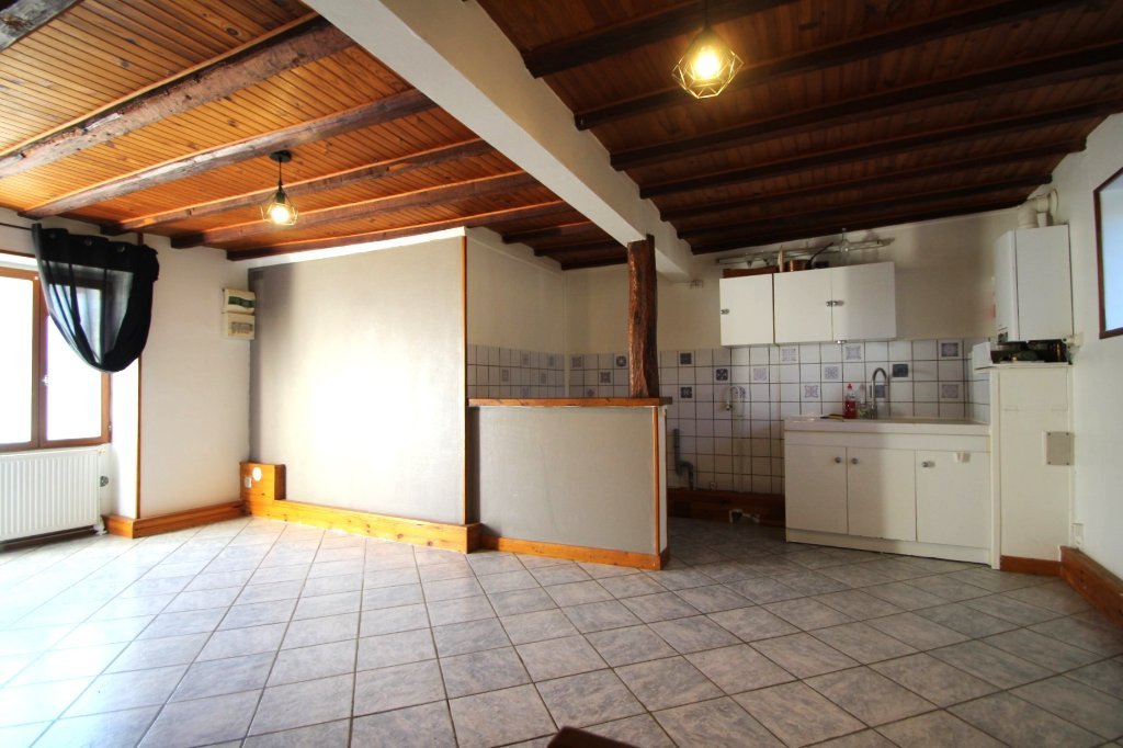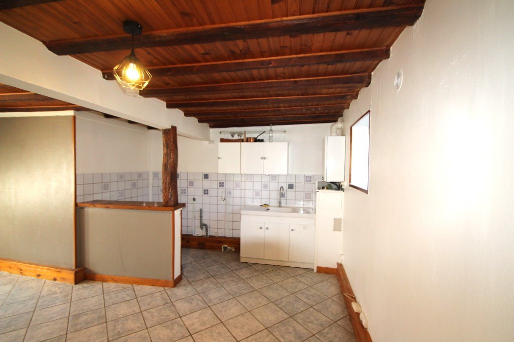 Appartement T2 en RDC comprenant un salon ouvert sur une cuisine simple, une chambre, une salle de bains et un WC.