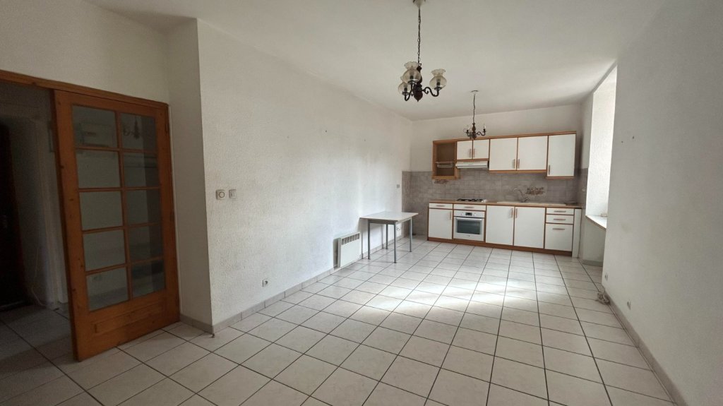 Un appartement de type 3 comprenant une entrée, un séjour ouvert sur cuisine équipée (four, hotte, plaques de cuisson)