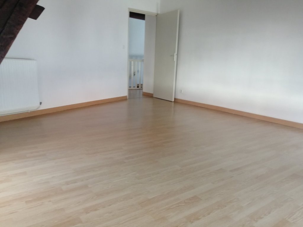 Appartement en duplex dans une maison de ville comprenant au RDC : entrée, séjour, cuisine équipée (plaques vitrocéramique et hotte), une salle de bains - A l'étage : 3 chambres. Une cave