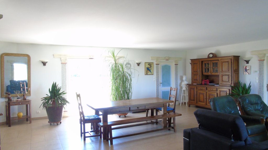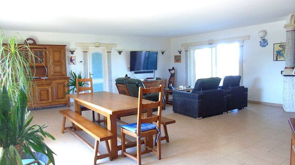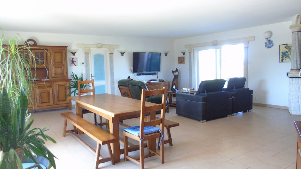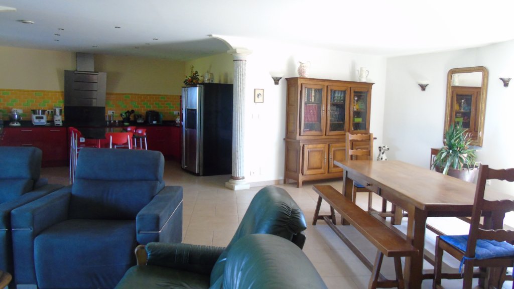 elle se compose d'une entrée avec deux placards, un grand séjour double donnant sur une cuisine ouverte aménagée et équipée, une arrière cuisine avec buanderie et un WC, une salle d'eau avec douche à l'italienne et baignoire, un bureau, quatre chambres et un 2 ème WC. Une cuisine d'été, une chaufferie et une pièce de vie.